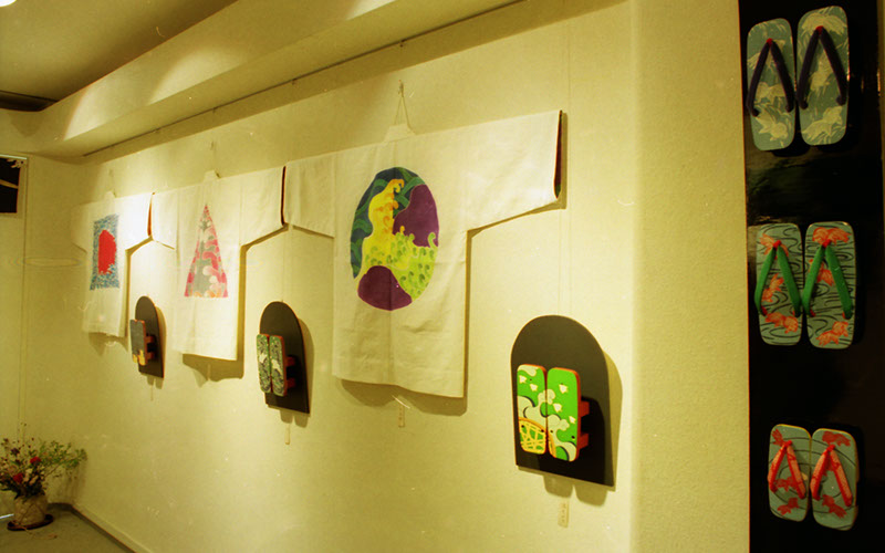 「下駄」に「半纏」を組み合わせて “木と布・漆と染”という異素材の組み合わせでビジュアル表現をした。
