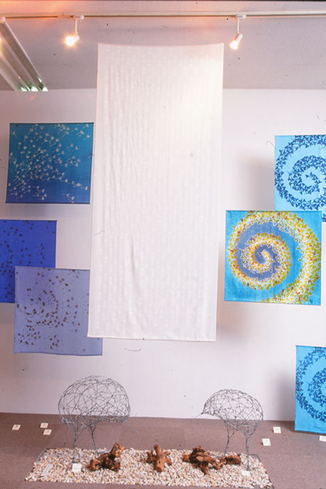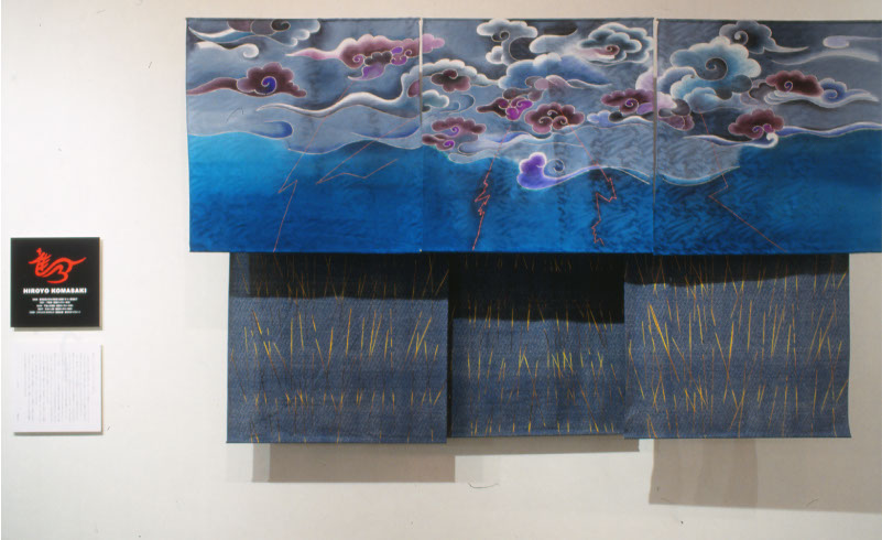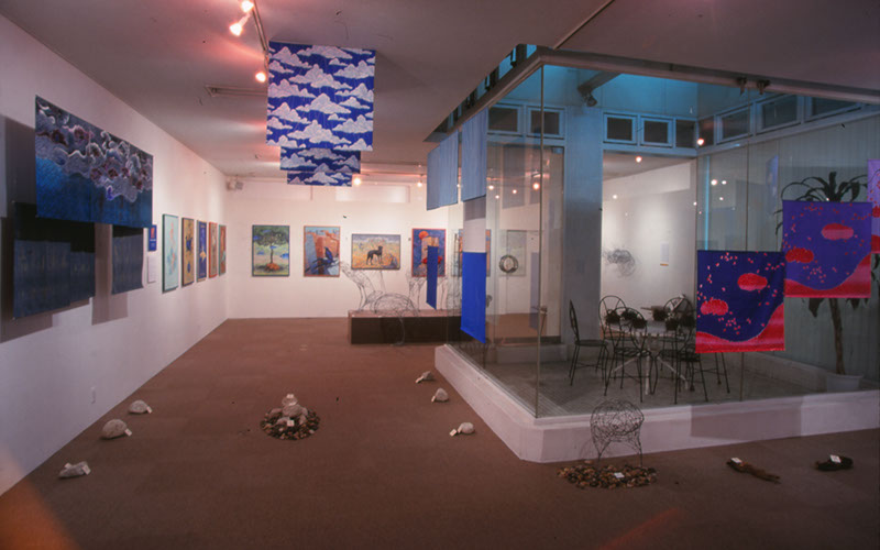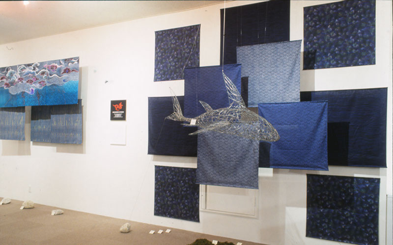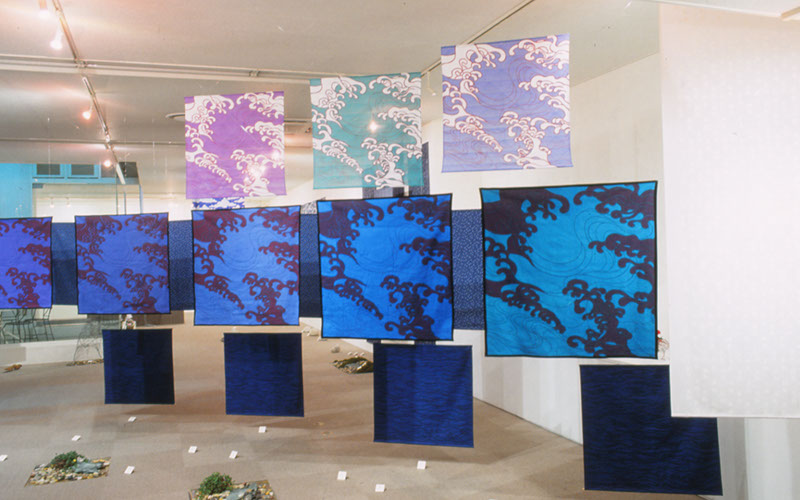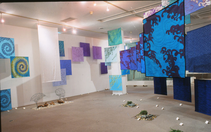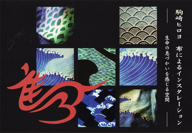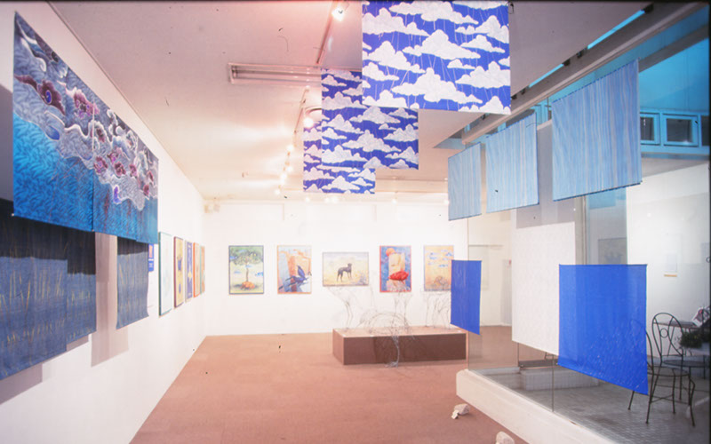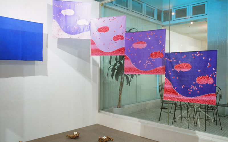 Exhibition展覧会-1999年『駒崎ヒロヨ・布によるインスタレーション』- 床面積132㎡・壁面積46㎡という広い空間を「生命の息づかいを感じる空間」というテーマで福留哲夫氏と共有し、 同時同場所において作品はそれぞれのスタイルによる作品展(布以外の立体・絵画作品は福留氏の作品) 私は「和のフォルム」の一つである "枡"= 正方形を意識し、あえて布サイズを全て70㎝の正方形で捉え表現をした。