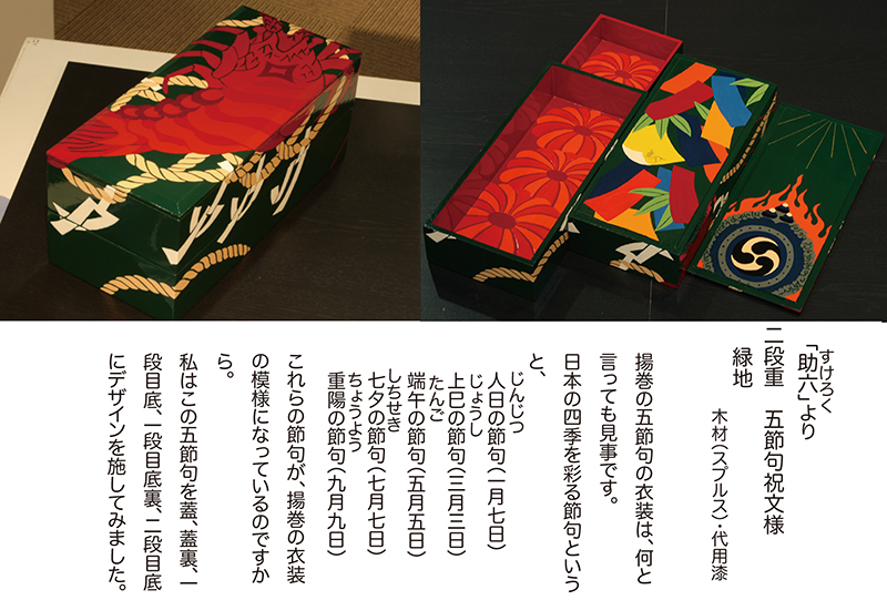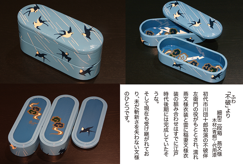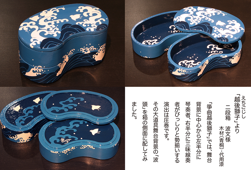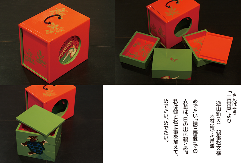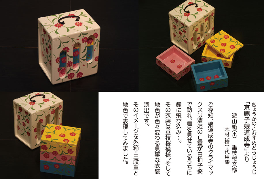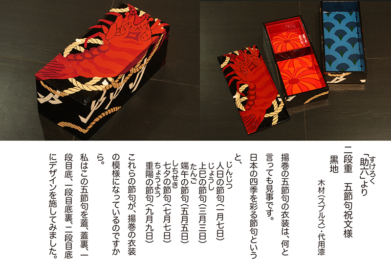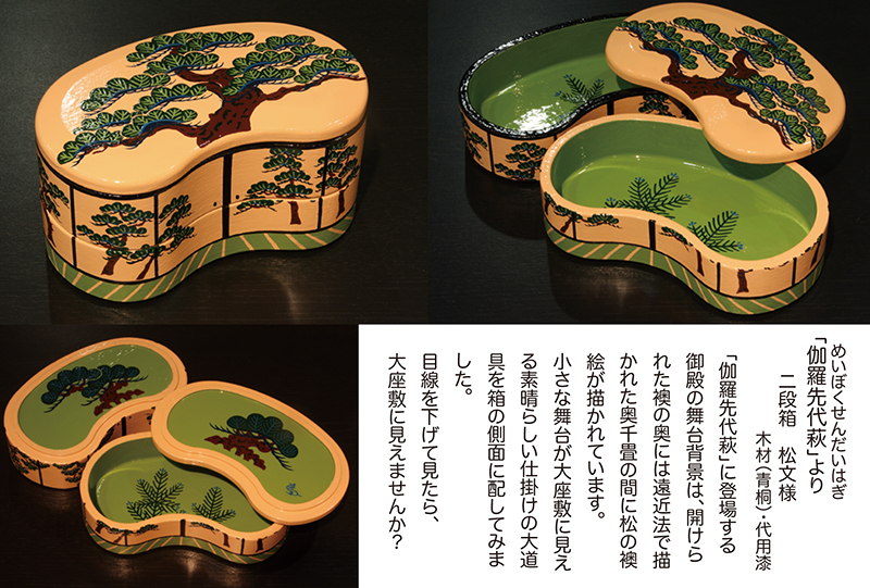 『作家たちの歌舞伎祭り展』にあたって担当のディレクターから、以前手がけていた"下駄"のイメージで弁当箱を制作できないかと意見を頂き「あの”遊山箱”を作ってみよう」と思ったのです。